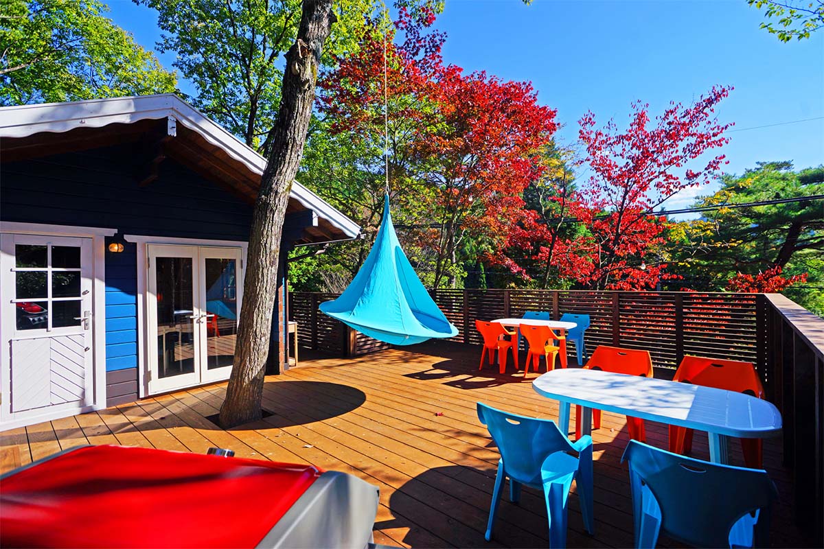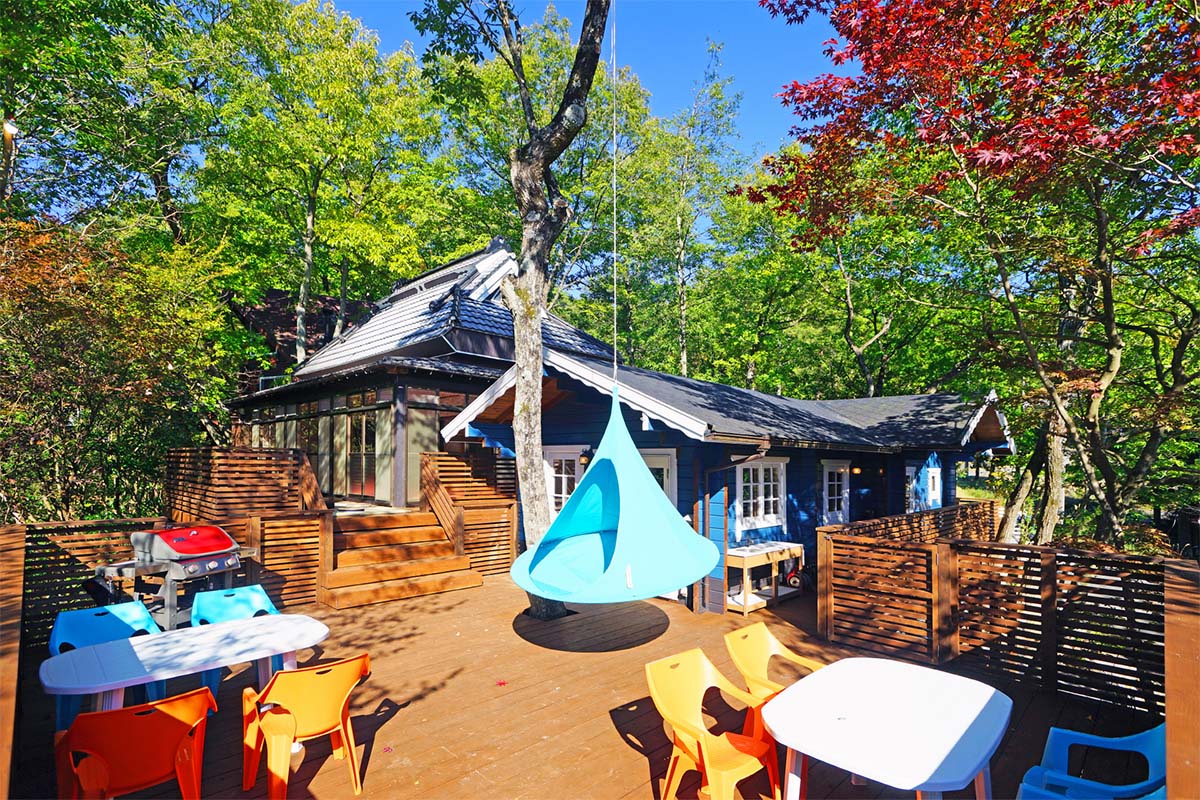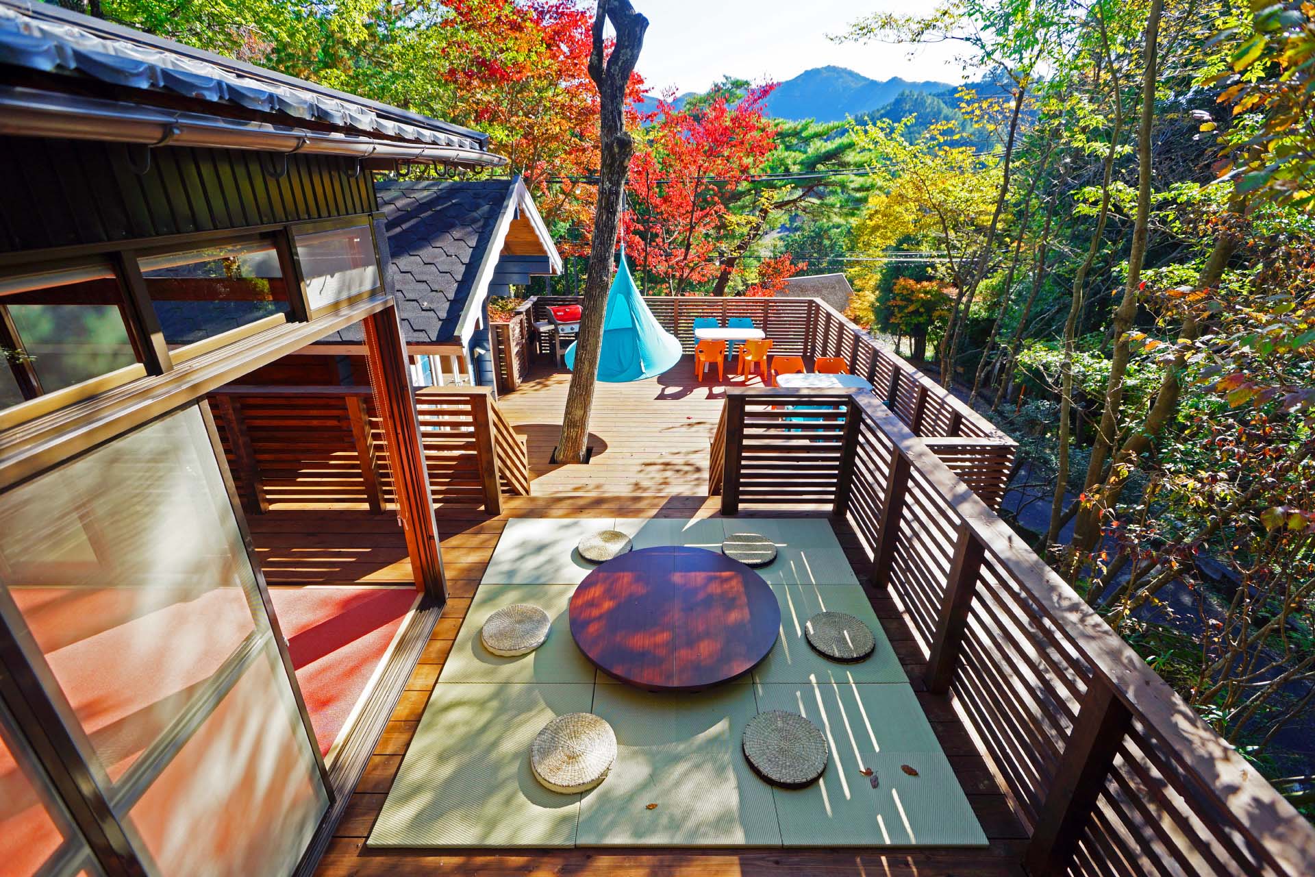 大人数でも余裕のある広いウッドデッキ