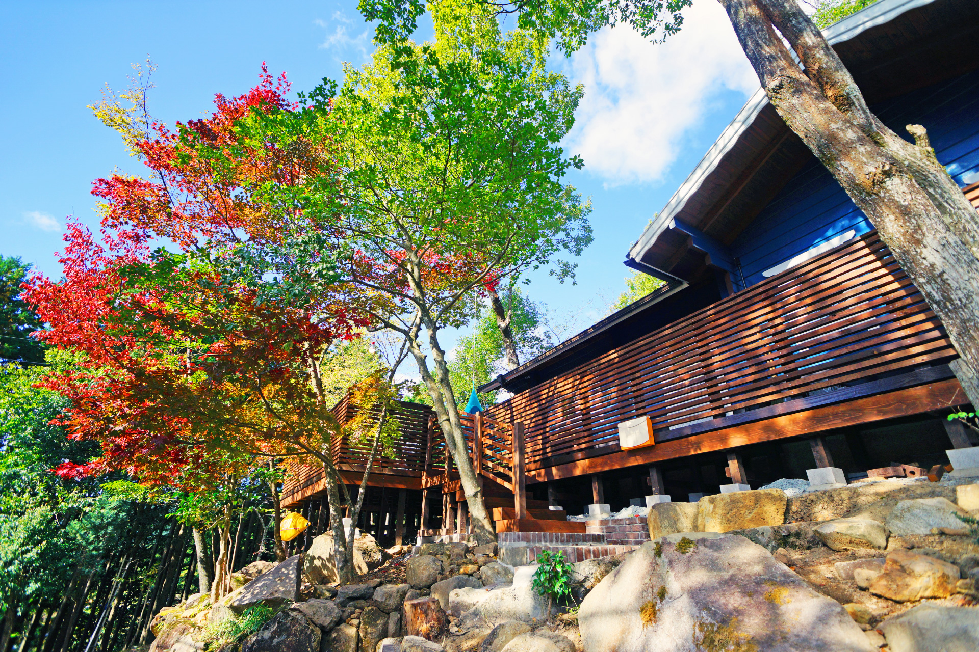 ・広い ウッドデッキ が囲う素敵な ログハウス と 古民家