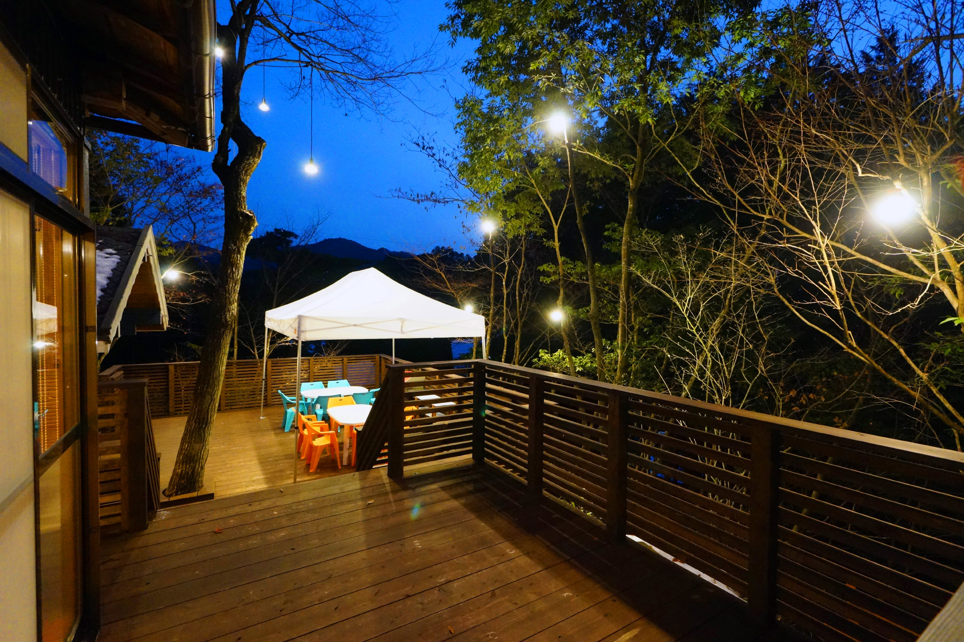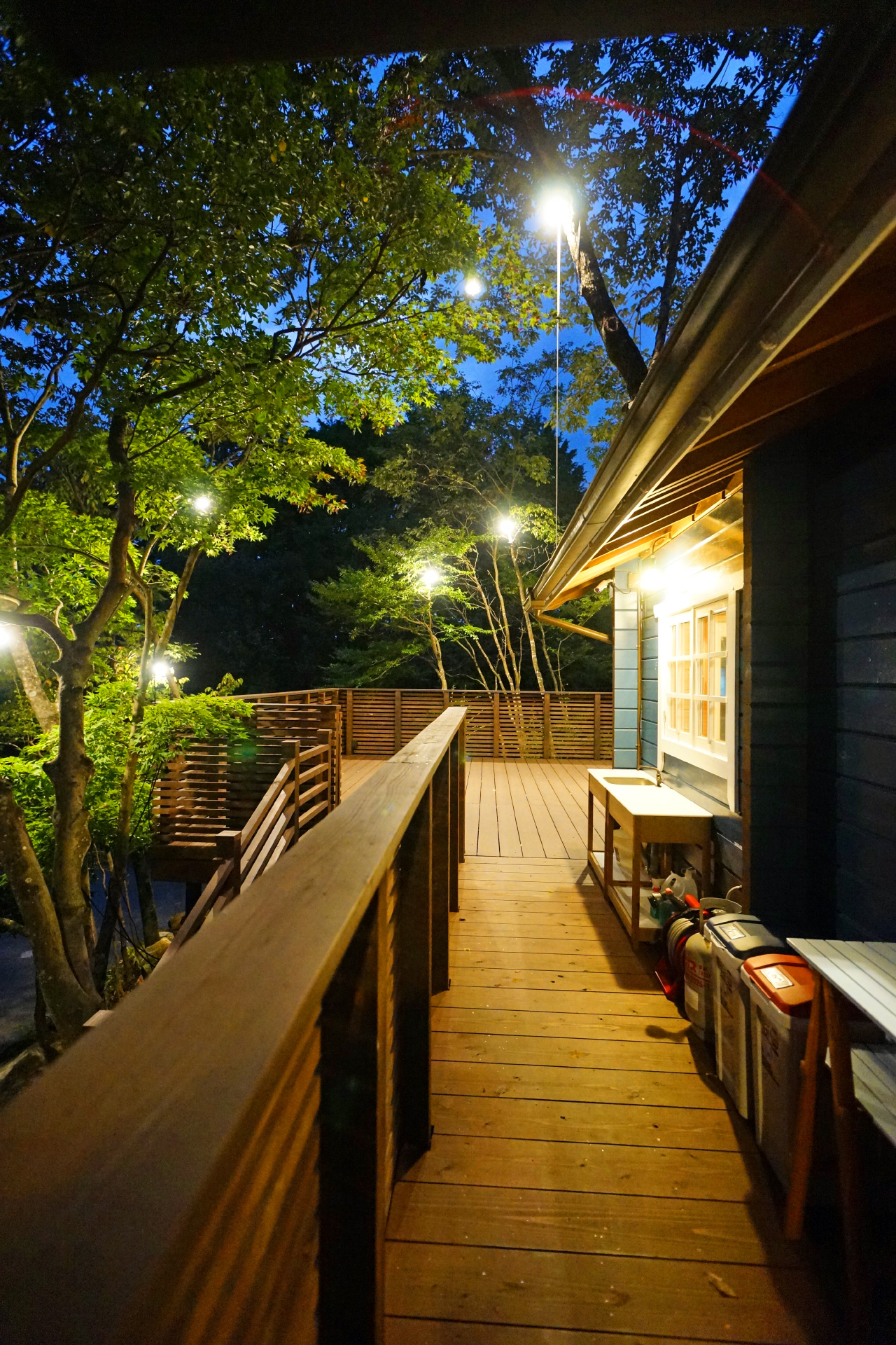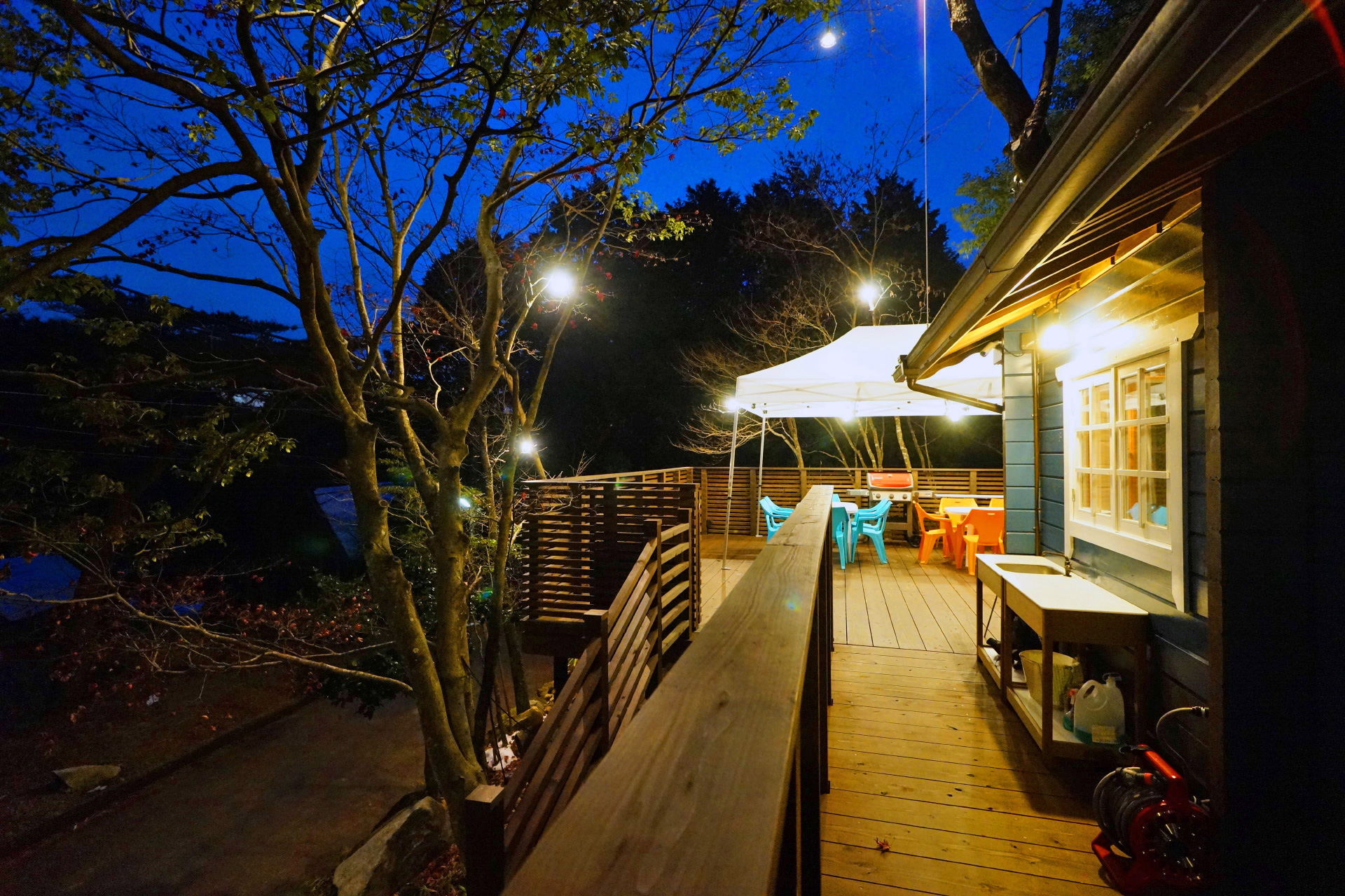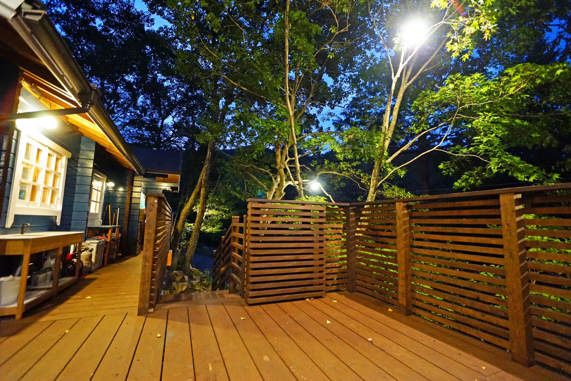 ・夜でも明るい ウッドデッキ の照明で食べ明かしたり